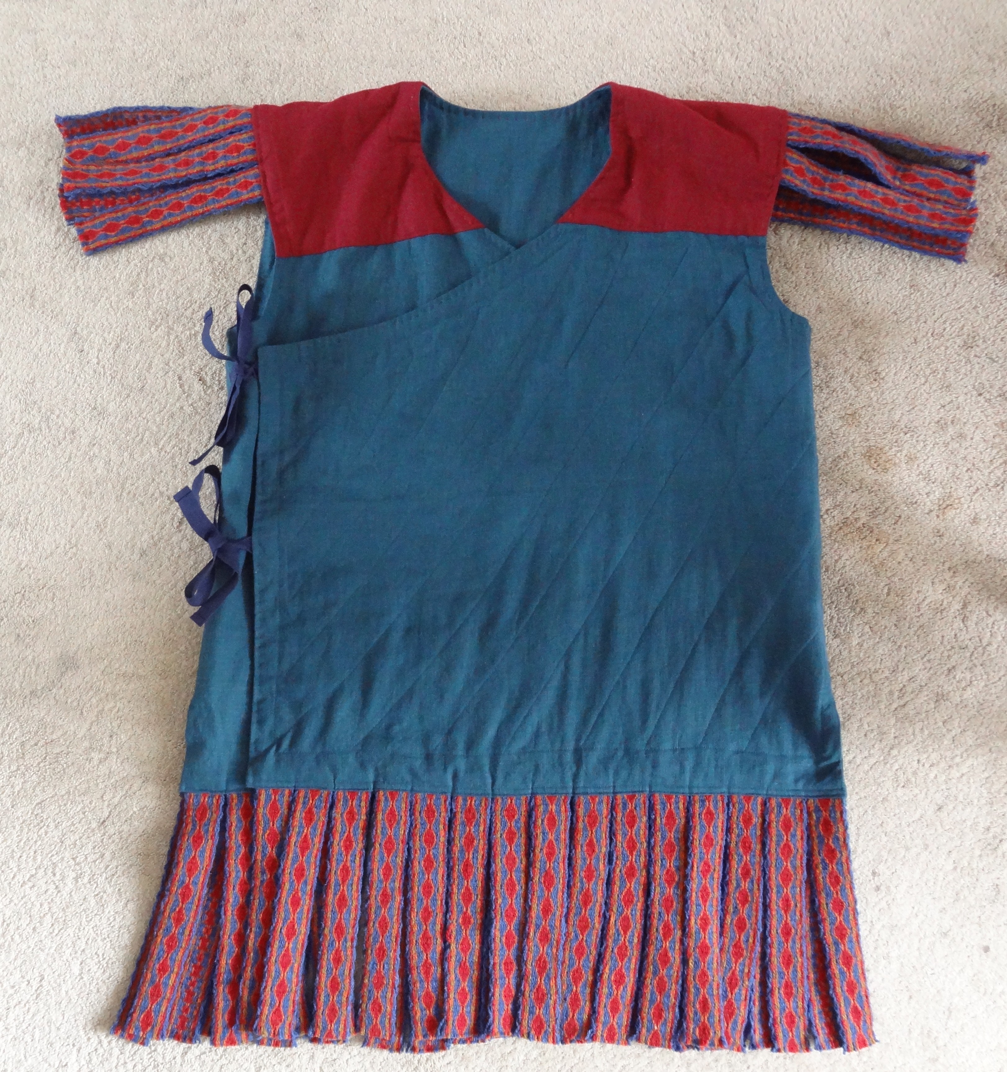 De kleding bij de Mithras-ceremonie was rood, een tunica met pofbroek en een muts met punt. Hier zie je de rode tunica en broek die ik in opdracht van een re-enactor heb gemaakt.
